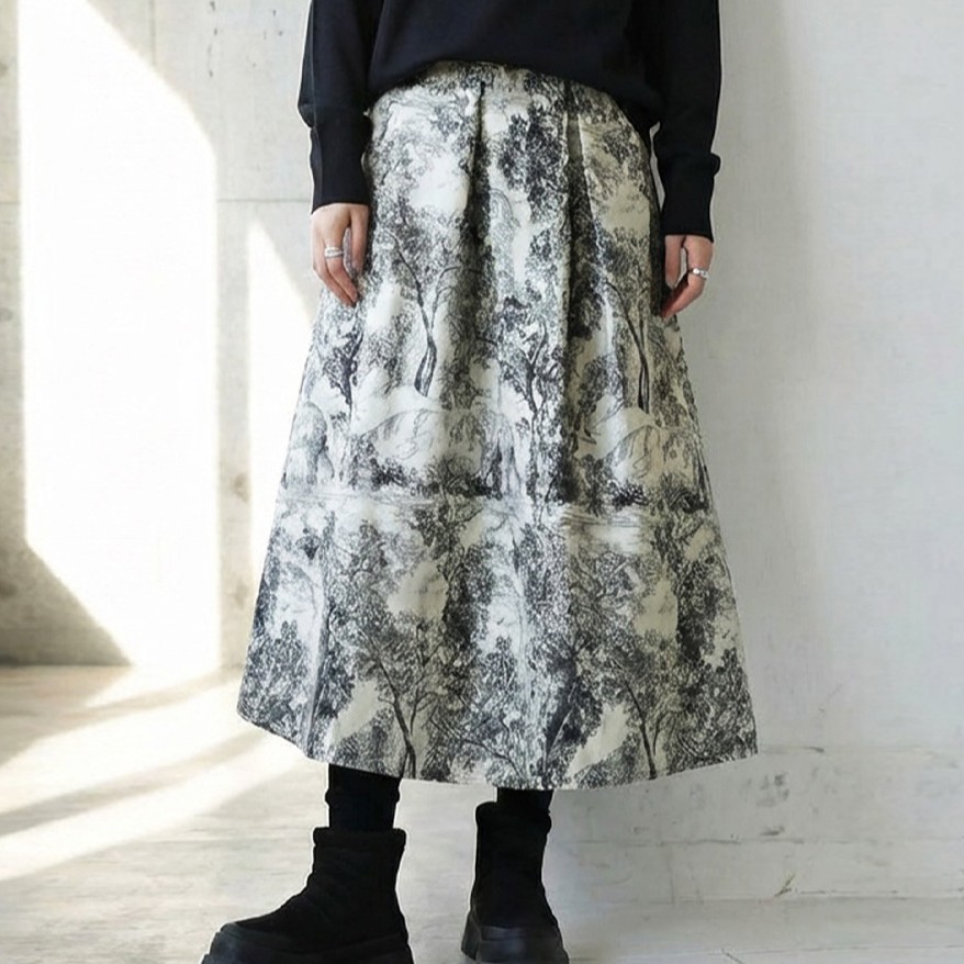 繊細な線画で描かれた動物や草のモチーフが印象的な『トワルドジュイ柄フレアスカート』
